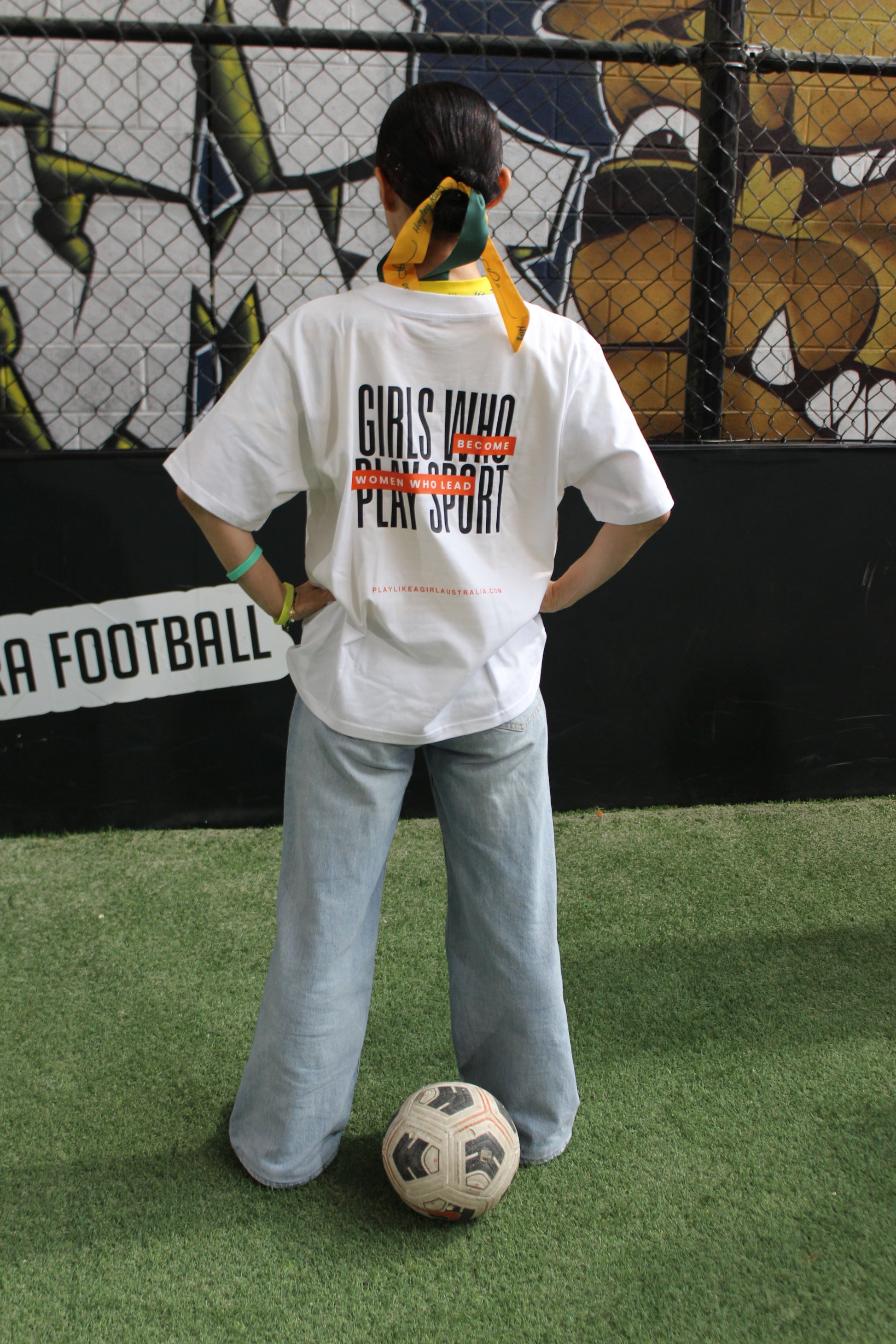 Featuring our Play Like A Girl logo on the front and the message “Girls who play sport become women who lead” on the back, this t-shirt represents the power of sport to build confident, capable women.